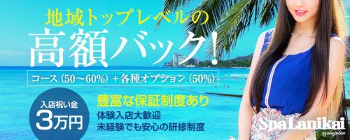 『Spa Lanikai~スパ ラニカイ~』は業務拡大につきセラピストさんを大募集♪各種制度や各種待遇を充実させることで、働く女性にとって働きやすくやりがいのある環境をご準備しているんだとか☆セラピストさんの不安を解消するための努力は惜しまないという信頼のお店ですよ♪エリアトップクラスの高額バックと圧倒的な集客力でしっかり稼げるというのも嬉しいですね☆Spa Lanikai~スパ ラニカイ~は「高い客単価+高い送客」を実現してくれるそうですよ♪