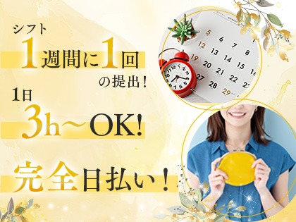 - ●11:00~翌5:00の中でお好きな時間 ・週1日からでも可! ・完全自由出勤制度(シフト制) ・1日4時間など短時間勤務も可