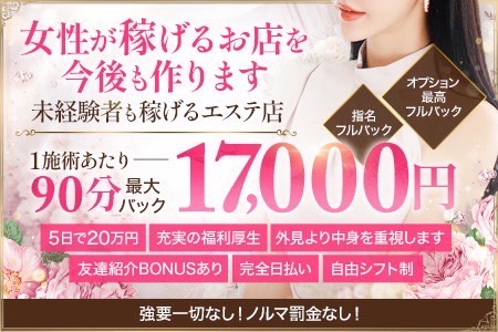 - ★当店はセラピストの皆様に以下をお約束いたします★ ◆働くセラピストさんの環境を第一に考えます!(どんな些細なことでも相談に乗ります) ◆完全日払い! ◆50%〜75%バック【随時昇給制度があります】 ◆指名料、オプション全額100%バック(8割程度のお客様がオプションを付けていただけます) ◆入店祝い金あり! ◆頑張っていただいた分だけ稼げる仕組みを用意いたします! ◆AM10:00〜AM5:00の間のお好きな時間帯に勤務可能です ◆ノルマ、罰金、雑費等一切なし! ◆未経験の方大歓迎! ◆ヘアアイロン、コテ、空気清浄機、加湿器などアメニティ充実! ◆インターネットWiFi完備!(待機時間は快適) ★お給料について★ 以下1日のパターンの一例です。 勤務時間 13:00~22:00 ①13:00~15:00 120分コース 基本コース:8,000円 オプション1:2,000円 オプション2:2,000円 指名料:1,000円 セラピストさん合計:13,000円 ②15:30~17:00 120分コース 基本コース:8,000円 オプション1:2,000円 オプション2:2,000円 セラピストさん合計:12,000円 ③18:00~20:00 120分コース 基本コース:8,000円 オプション1:2,000円 セラピストさん合計:10,000円 ④20:30~22:00 90分コース 基本コース:6,000円 オプション1:2,000円 オプション2:2,000円 セラピストさん合計:10,000円 【1日合計:45,000円】 セラピストさんファーストで生き生きと働いていただける環境を用意いたします!