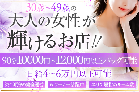 - ・完全歩合制(バックは50%からスタートし60%まで昇給します。) ■本指名の場合(例) 90分14,000円→8000円報酬(57%) 120分17,000円→10,000円報酬(58%) 150分24,000円→14,000円報酬(58%) 180分24,000円→17,000円報酬(60%) ※指名料100%バック ※オプション100%バック