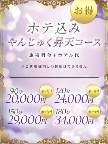 ♦やんじゅく昇天コース♦ 90分 18,000円 120分 22,000円 150分 27,000円 180分 32,000円 ※金・土・祝前日に限り、ご自身でホテル確保の場合は2,000円割引 ♦南インターホテルやんじゅく昇天コース♦ 70分 16,000円 90分 17,000円 120分 21,000円 150分 26,000円 180分 31,000円 ※ご新規様割との併用はできません。 ※ホテル代3,000円(土日祝3,500円) ♦隠れ家コース♦ 60分 10,000円(60分 南インター限定) 90分 14,000円 120分 18,000円 150分 22,000円 180分 26,000円 30分延長 6,000円 京都市内交通費 0円 指名料 0円(指名料込) ※「新規様割」「他クーポン」併用不可 ♦市内交通費♦ 0円 ♦指名料♦ 1,000円~5,000円 ※ご自宅・ビジネスホテル・シティホテルへの派遣になります。 京都市の条例により24時以降のご利用の場合、ビジネスホテル/シティホテルにつきましては、京都市宿泊税(お一人様200円)加算されますのでご了承くださいませ。 |
