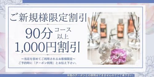 「週刊エステ見た」とお伝えください♪ご新規様限定!90分コース以上 1000円割引!※ご予約時に「クーポン利用」とお伝え下さい。※他のクーポンとの併用はできませんのでご了承下さい。週刊エステ見たで割引がスムーズにご案内できます。 070-2277-5229