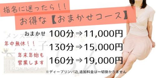 90分 10,000円 120分 14,000円 150分 18,000円 180分 21,000円 240分 28,000円 300分 35,000円 指名料 1,000円 ディープリンパ +10分 2000円 (9割以上のお客様にお選び頂けて大変おすすめです) 延長30分 5,000円 ■割引イベント 【新規割】ご新規様1,000円引き 【メルマガ割】メルマガの合言葉を頂くとリピーター様も割引 |