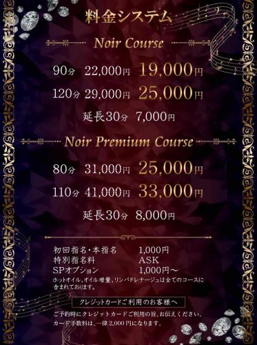 ■Noir course■ 60分 19,000円→17,000円 90分 23,000円→20,000円 120分 30,000円→26,000円 150分 30,000円→26,000円 ■Noir Premium Course■ 80分 34,000円→26,000円 110分 42,000円→34,000円 Options Set バリュー 5,000円→3,000円 デラックス 12,000円→7,000円 |