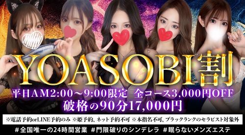 ☆平日AM2:00~9:00限定☆全コース3,000円OFF!破格の90分 17,000円!※電話予約orLINE予約のみ※姫予約、ネット予約不可※本指名不可、ブラックランクのセラピスト対象外『週刊エステ限定割を見た』と必ずお伝えください♪週刊エステ限定の割引サービスです。週刊エステ見たで、最大8,000円引き!▼El Tera Course60分 19,000円→ 17,000円90分 23,000円→ 20,000円120分 30,000円→ 26,000円150分 36,000円→ 31,000円ベーシックな王道の流れでドライマッサージからとろとろオイルによる濃厚ディープマッサージと完全密着コース▼Royal Course80分 34,000円→ 26,000円110分 42,000円→ 34,000円仰向けメインによる、ホイップ、パウダー使い放題+衣装チェンジ2,000円分付きのディープリンパ無制限のコミコミコース▼指名料写真指名 1,000円本指名 1,000円GOLDランク 1,000円PLATINUMランク 2,000円DIAMONDランク 3,000円BLACKランク 4,000円※本指名料0円▼オプション延長20分 6,000円延長30分 8,000円延長30分(80分・110分コース) 9,000円ディープリンパ 10分 1,000円パウダーマッサージ 2,000円ホイップマッサージ 2,000円バリューセット 3,000円デラックスセット 7,000円オプションの詳細に関しては、ご入室後セラピストより直接ご説明いたしますのでお好みでご選択ください。週刊エステ見たで割引がスムーズにご案内できます。 080-3521-1651