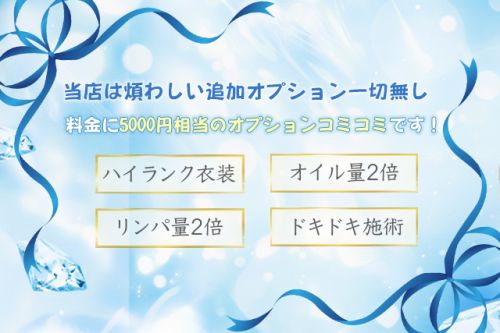 【コース料金】 ●90分コース:20,000円 ●120分コース:25,000円 ●150分コース:30,000円 【基本料金】 ●指名料:0円 ●本指名料:1,000円 ●延長(30分):6,000円 【オプション料金】 当店の料金には5000円相当のオプションがコミコミです! |